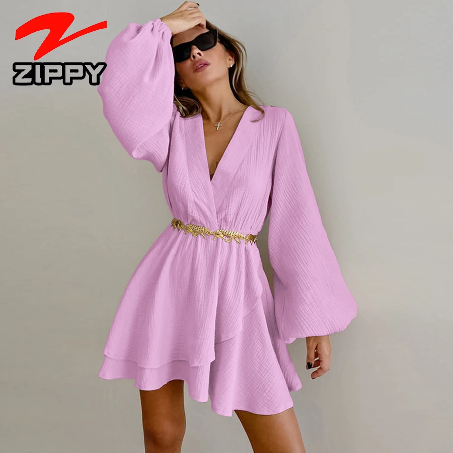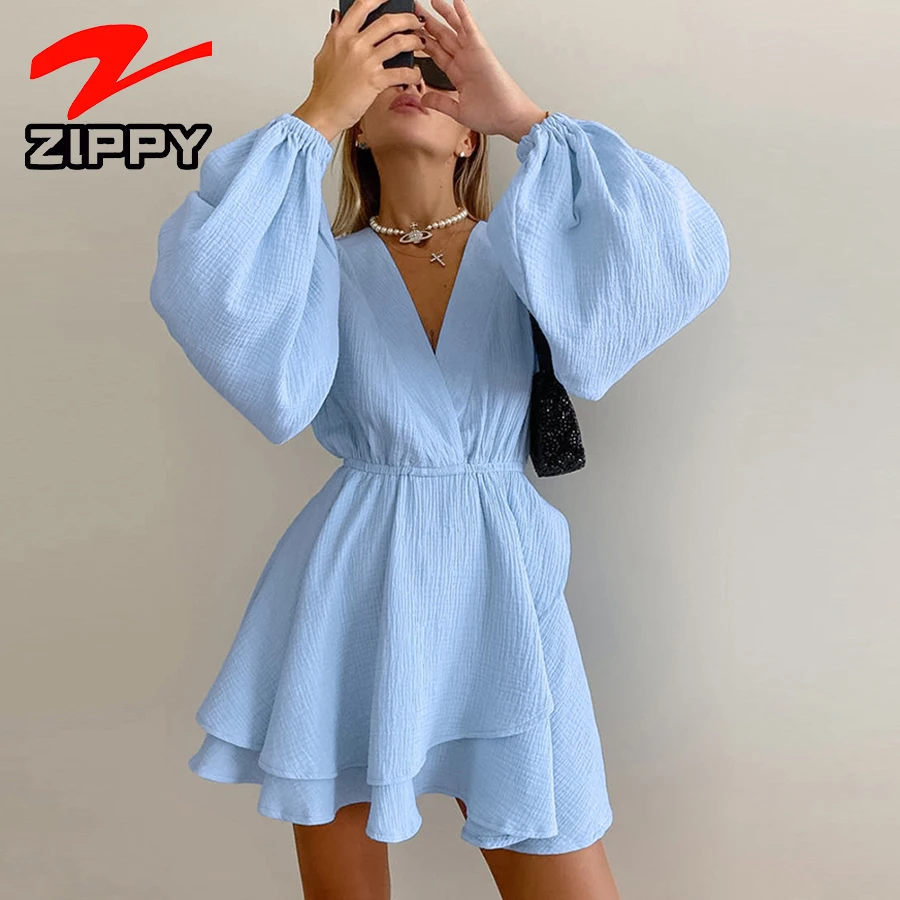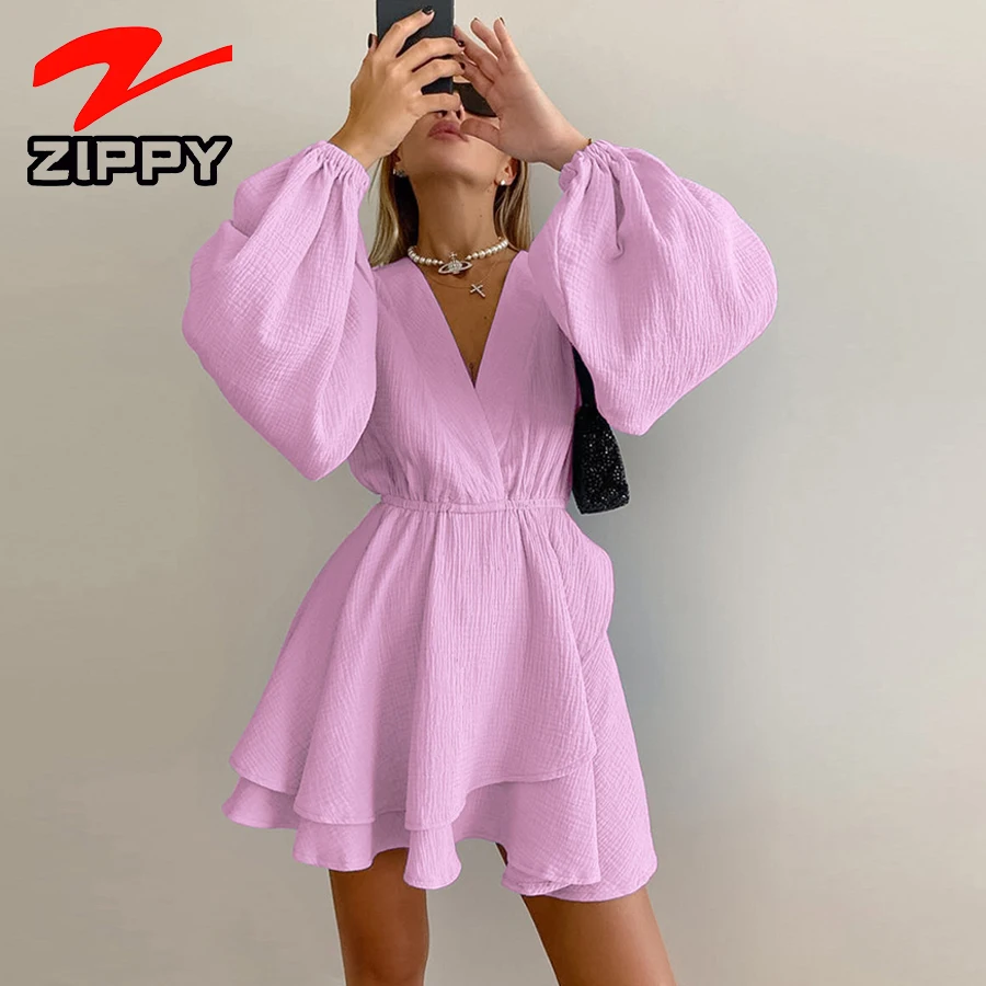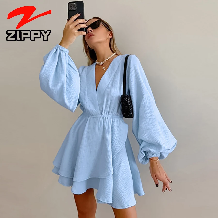 ZIPPY Customize Women Sexy V-Neck Balloon Sleeve Short Dress Elastic Waist Layered Ruffle Hem Design Casual Mini Dress